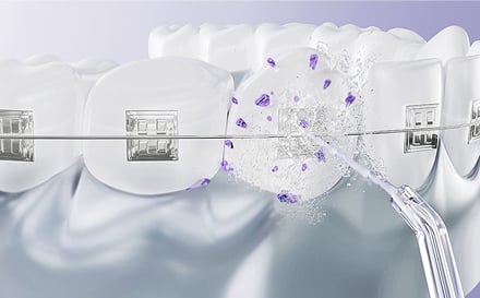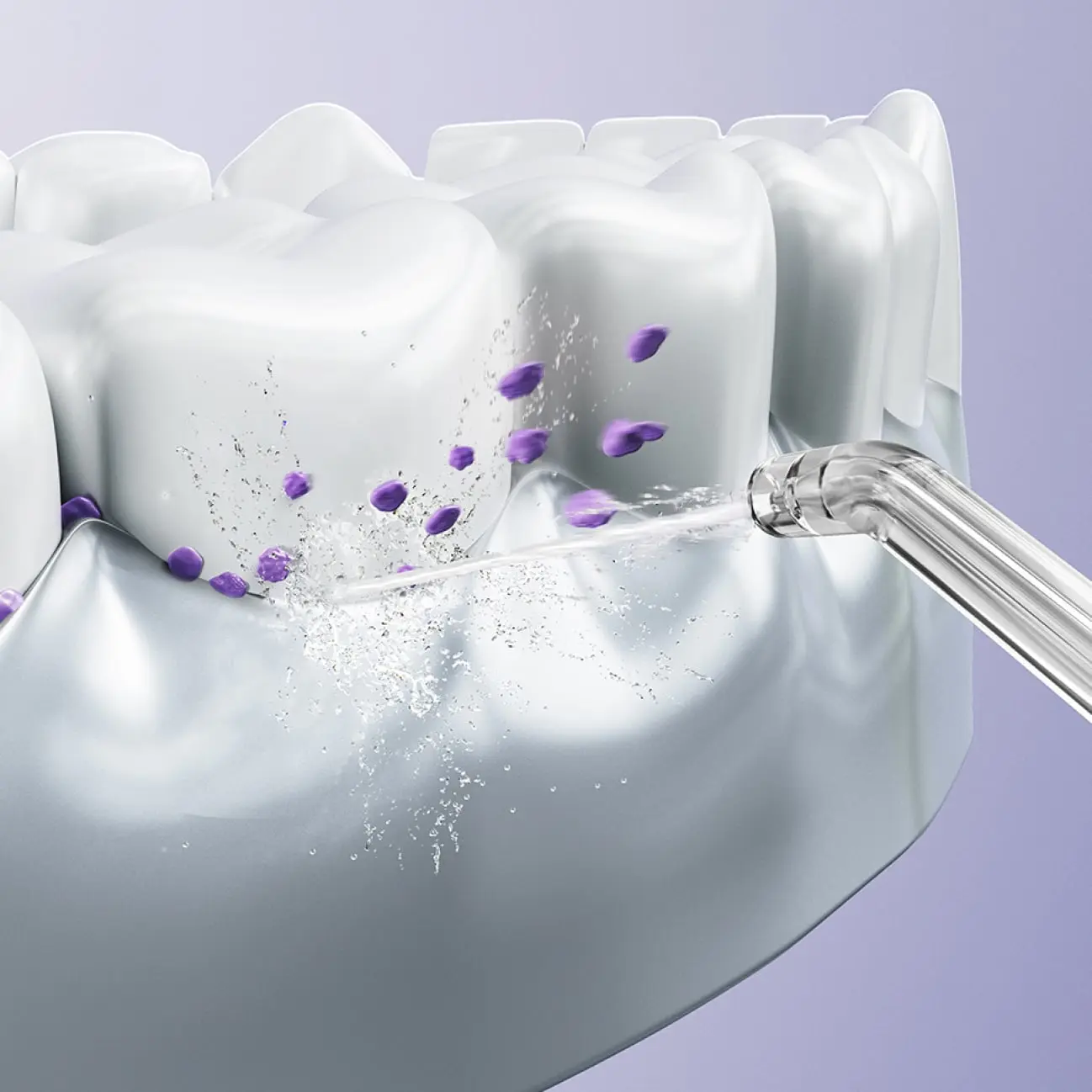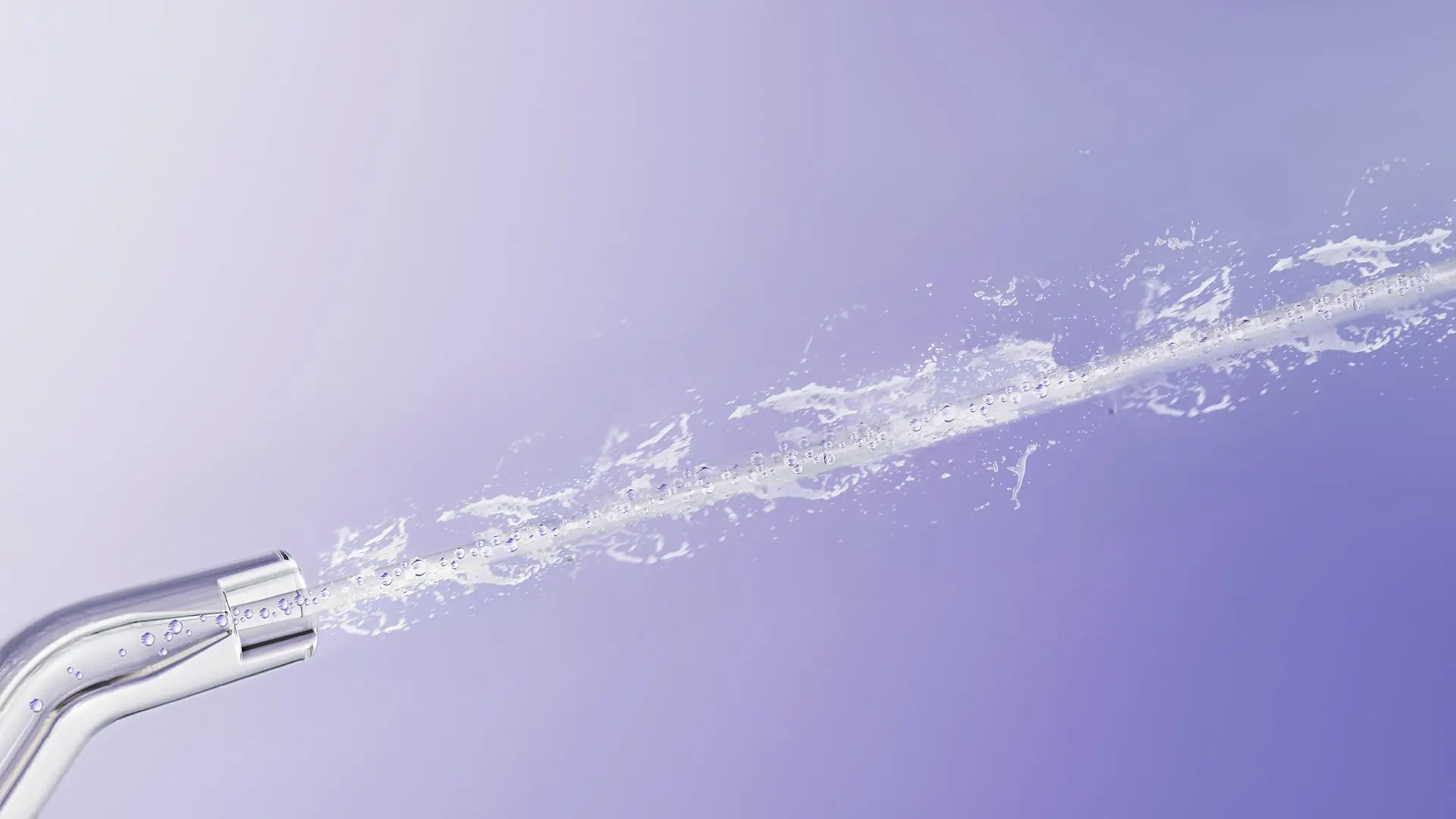 水流の力で歯ブラシが届きにくい歯間や歯周ポケットの歯垢を弾き飛ばす。