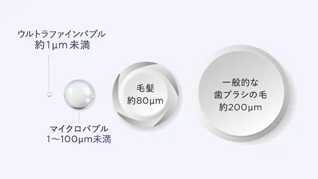 直径1μm未満の微細な泡が歯の隙間に入り込み、汚れに吸着し、剥がし落とす。